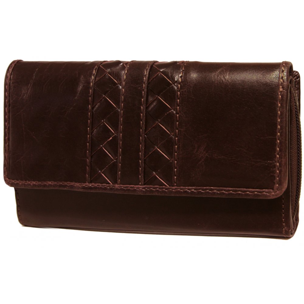 Damplånbok i oxläder med quiltat mönster på framsidan. Insidan består av nio kortplatser, ficka med fönster,
