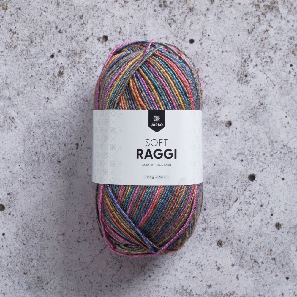 Soft Raggi 100g - Pink print (44453)Ett underbart garn att sticka små sockor med, mjukt och följsamt